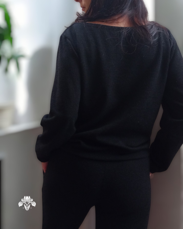 Conjunto de lanilla negro, de textura suave y tejido elastizado que se adapta al cuerpo con comodidad. Perfecto para los días fríos de otoño e invierno, es una prenda versátil y elegante, ideal para combinar con cualquier look.