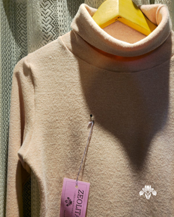 Suéter polera de lanilla color rosa, de textura suave y tejido elastizado que se adapta al cuerpo con comodidad. Perfecto para los días fríos de otoño e invierno.