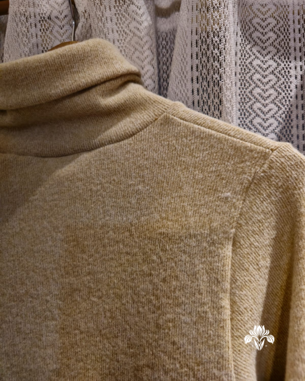 Suéter polera de lanilla color safari, de textura suave y tejido elastizado que se adapta al cuerpo con comodidad. Perfecto para los días fríos de otoño e invierno.