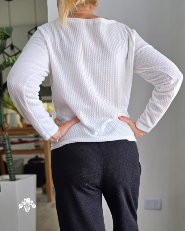 Suéter de tela waffle en tono blanco, diseñado para ofrecer suavidad y confort. Su tejido liviano y transpirable lo convierte en una opción perfecta para el día a día, combinando simplicidad y estilo en una prenda versátil.