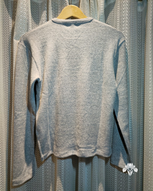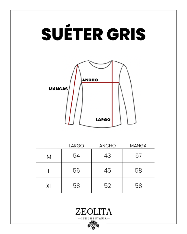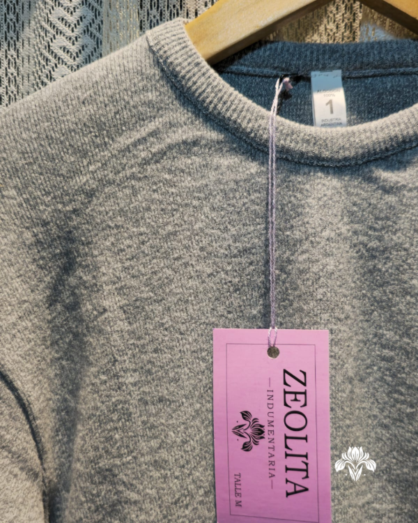 Suéter de cuello redondo gris, de textura suave y tejido elastizado que se adapta al cuerpo con comodidad. Perfecto para los días fríos de otoño e invierno, es una prenda versátil y elegante, ideal para combinar con cualquier look.