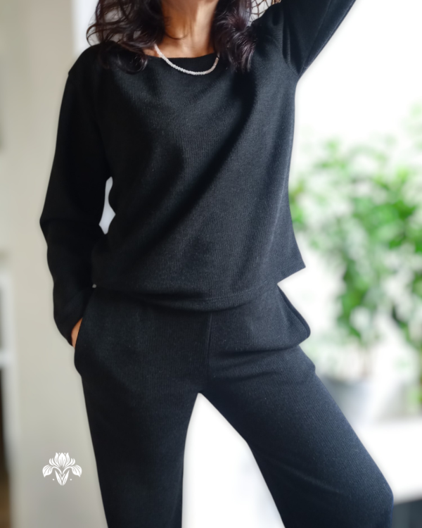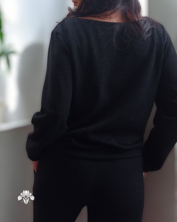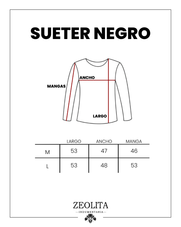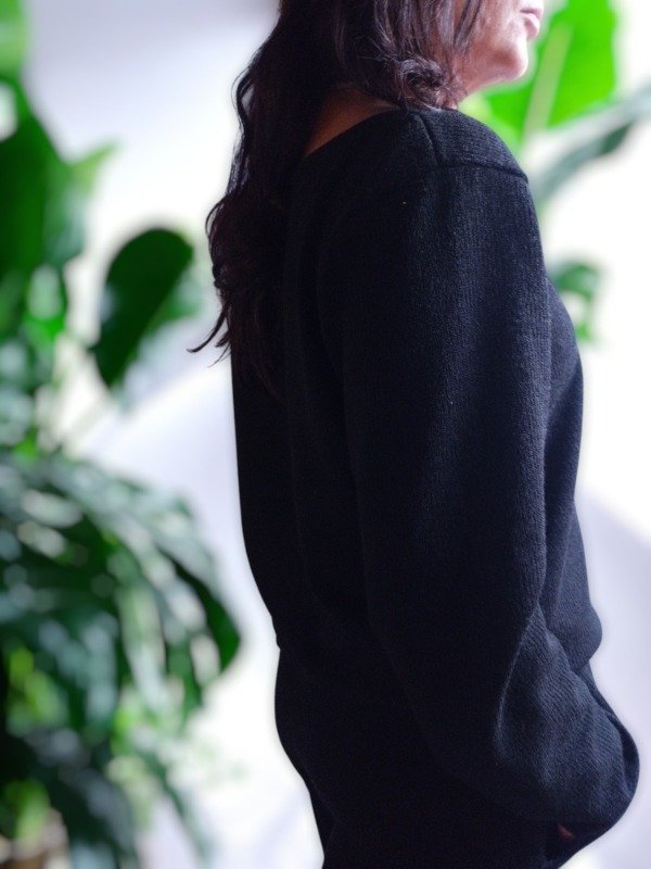 Suéter de lanilla negro, de textura suave y tejido elastizado que se adapta al cuerpo con comodidad. Perfecto para los días fríos de otoño e invierno, es una prenda versátil y elegante, ideal para combinar con cualquier look.